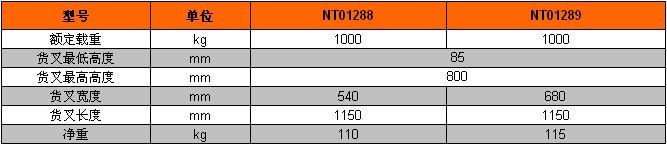 额定载重1000kg最低高度85mm最高高度800mm净重110/115kg